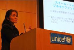 アフリカの教育支援にご寄付の使途を限定してご協力いただく毎月の募金プログラム『ユニセフ・マンスリーサポート・プログラム スクール・フォー・アフリカ』。現在、日本の皆さまからのご寄付は、ブルキナファソの教育支援のために、大切に活用されています。2016年1月13日、ユニセフ・ブルキナファソ事務所で教育プログラムチーフを務める渋谷朋子氏が2015年度に皆さまのご寄付で実現した教育支援について、学校に通っている子どもたちの様子や、教師、ブルキナファソ事務所のスタッフからのメッセージ動画を交えながら報告を行いました。