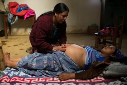 妊娠7カ月の妊婦のもとを訪れた助産師歴20年のマルガリータ・フリアさん。「最初の1000日」の栄養改善は、お母さんのおなかの中にいる胎児の期間も含まれる。 |
