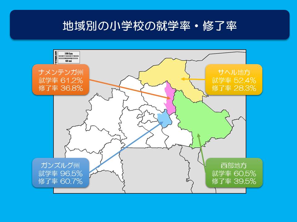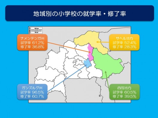 サヘル地方は、治安が不安定な状況で就学状況が最も遅れている地域であり、現在、半数の子どもたちが小学校に就学することができないため、ユニセフは現在、サヘル地方を中心に教育支援を行っています。さらに2018年からは、西部地方にも支援を拡大していく予定です。小学校の就学率・修了率が各地域で異なるのは、文化的な要因や貧困などが理由として上げられます。
