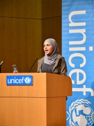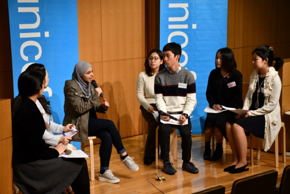 2019年3月、ユニセフ親善大使のマズーン・メレハン大使がユニセフハウスを訪問。シリア難民としての体験や教育活動家としての経験と想いを語った後、ボイス・オブ・ユースJAPAN で活動する同年代の大学生たちと、教育の大切さや互いの活動について意見を交わしました。
