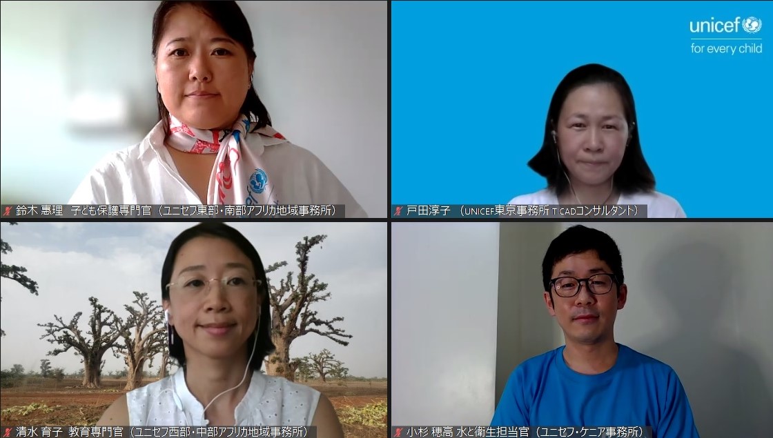 (右上から時計回りに)戸田淳子(UNICEF東京事務所TICADコンサルタント)、小杉 穂高(ユニセフ・ケニア事務所 水と衛生担当官)、清水 育子(ユニセフ西部・中部アフリカ地域事務所 教育専門官)、鈴木 惠理(ユニセフ東部・南部アフリカ地域事務所 子どもの保護専門官)