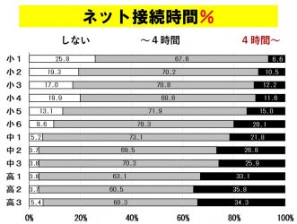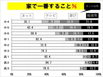 例えば、「家で一番すること」という質問では、ネット、テレビ、遊び、勉強(ネットを使った勉強は「勉強」)の選択肢の中で、小学校6年生以上は50%以上が「ネット」と回答。