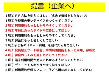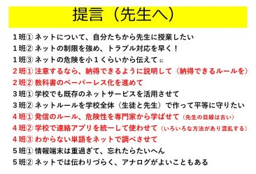 ネット利用について話し合った後、後半は提言作り。①保護者に ②先生に ③国・自治体に ④企業に ⑤自分たちに 対して、してほしいこと、してほしくないことを一人ひとり挙げていき、最後に班で話し合って①から⑤まで、それぞれ2つずつの提言にまとめました。