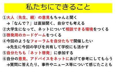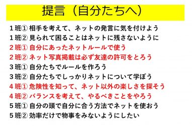最後に自分たちへも提言をした子どもたち。ネットに頼ったり、無意識にやってしまうことを冷静に振り返りながら、自らや友だちへ提言しました。