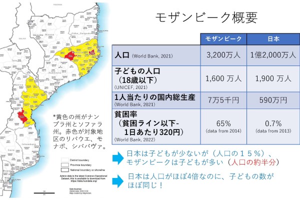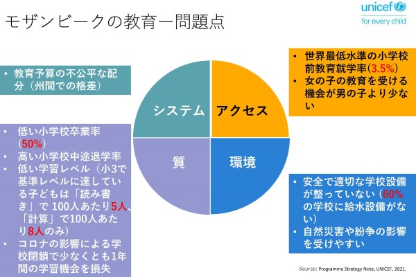 ユニセフは、日本の皆さまからのご寄付で、モザンビークの中でも特に初等教育の普及が遅れているナンプラ州とソファラ州を対象に教育支援を行っています。全般的に社会指標が低く、気候変動や自然災害、また、紛争発生のリスクが高いことも選定された理由です。