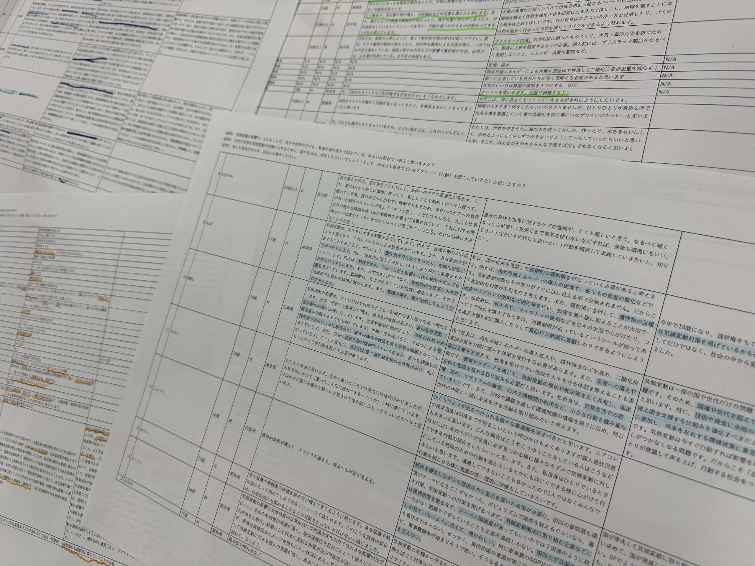 まずは3グループに分かれ、気候変動について寄せられた311件の意見(詳しくは後述)から、それぞれに気になる「キーワード」を拾い出す作業に取りかかりました。
