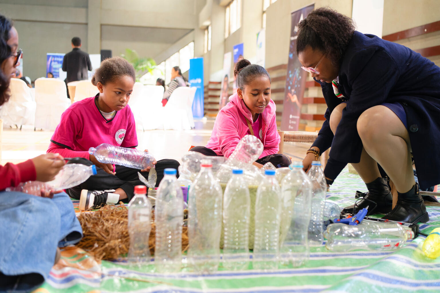 ペットボトルのリサイクルについて学ぶ子どもたち(マダガスカル)