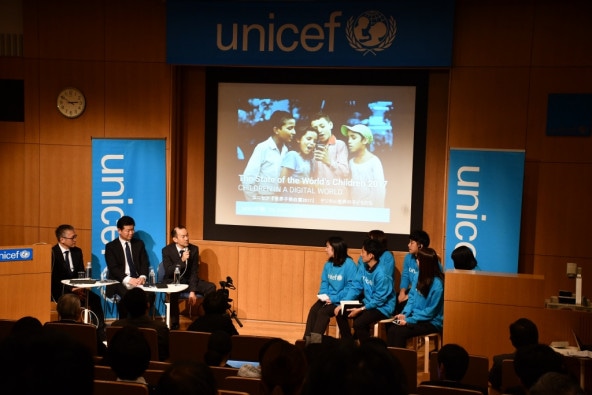 開催報告(1)では、ユニセフの世界子供白書2017のテーマである「デジタル世界の子どもたち」に沿って、インターネット上の危険から子どもたちを守るとともに、デジタル技術を最大限に活用するためにはどのような取り組みが必要なのか、ユニセフ事務局長のアンソニー・レークが発表するとともに、大学生とのトークセッションを行いました。