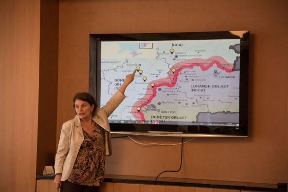 ユニセフ・ウクライナ事務所代表より、訪問予定地について説明を受ける。赤い線が、政府管理下にある地域と親ロシア派の支配地域とを分断するコンタクト・ライン。 |