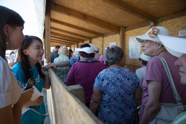 5つのチェックポイントのうちの一つ、マリンカ・チェックポイント。灼熱の中長蛇の列に並んで待つ人々に話を聞くアグネス大使。 |