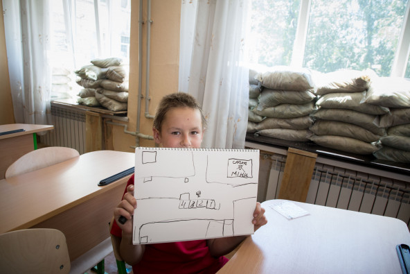 コンタクト・ラインの近くで暮らす子どもたちが、実際に被害に遭っています。同じ学校に通う10歳のミーシャ君は、2015年8月、家の近くの庭で砲撃が当たり頭に怪我をしました。2回の手術を経て、砲弾の破片を頭から取り出したといいます。そんな彼の住む家は、コンタクト・ラインの上にあります。「車の跡でどの戦闘用車両か分かるし、ミサイルランチャーを家の裏で見かけたこともある」と話します。