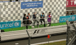 辻よしなりさん、関根麻里さんの司会で、チャリティ大抽選会が行われた「ユニセフ・チャリティオークション・グランドフィナーレ」(12日決勝レース後メインストレート上特設ステージで開催)には、日本を代表するレーシングドライバー脇阪寿一・薫一両選手の他、スペシャルゲストとして、元F1ドライバーの中島悟さん、片山右京さんが登場。また、レースを終えたばかりの中島一貴選手やエイドリアン・スーティル選手、そして今年トヨタF1チームのサードドライバーを勤める小林可夢偉選手も、サプライズゲストとして参加。レースの裏舞台などのトークを交えながら、チャリティ抽選やチャリティオークションに提供されたスペシャルグッズを紹介してくださいました。