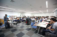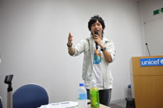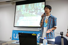 今年7月イタリア・ローマで開催されたJ8サミット2009には、G8国8カ国とG8国以外の6カ国から集まった子どもたち54名が参加しました。このサミットに日本代表として参加した渋谷教育学園渋谷高等学校2年の岡佑樹くんと小野暢思くんが、8月11日(火)にユニセフハウスで行われたユニセフリーダー講座でJ8サミット2009の報告をしました。