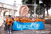 オレンジ色の“Listen … Act!”Tシャツを着たJ8参加者たちは、ローマの観光名所コロッセオの前に集まり、紙で作られた耳のオブジェを背景に「わたしたちの声を聞いて!」と呼びかけました。