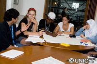 今年のJ8サミットには、G8サミット参加国と同じG8各国(カナダ、フランス、ドイツ、イタリア、日本、ロシア、英国、米国)と新興6カ国(ブラジル、中国、エジプト、インド、メキシコ、南アフリカ)から14歳〜17歳の子どもたち54名が集まりました。日本からは、渋谷教育学園渋谷高等学校2年の藤井萌子さん、小野暢思さん、岡佑樹さん、寺岡夕里さんが参加しました。