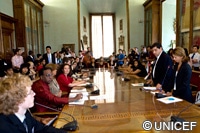 イタリア政府首相府で行われたJ8サミット2009開会式には、政府関係者や国内・海外メディアなど多くの人々が参加しました。イタリア政府は、J8参加者たちを歓迎し、世界へ向けて意見を発信しようとする子どもたちに激励の言葉を送りました。
