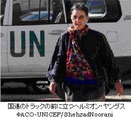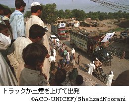 パキスタンのペシャワールを9月29日に出発した第一陣の指揮をとるのは、アメリカ人女性、ヘルミオン・ヤングス。丈の長い青いシャツを着て、頭にユニセフのスカーフを巻いた彼女はとても小さく見えます。彼女が決然とたたずむその後ろには、色とりどりの大型トラックが25台控え、これからユニセフの緊急支援物資200トンを、アフガニスタン北部のバダクシャンにいる子どもたちに届けるのです。2001年9月11日以来、アフガニスタンでは国連のトラック部隊の活動が中断していましたが、この日再び動き出すことになりました。