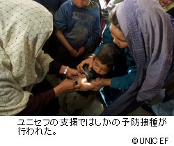 予防接種 ■保健:はしかによる死亡率を減少させる為に、ユニセフは2001年7月からはしかの予防接種キャンペーンを実施しました。2002年末までに、6ヶ月から12歳までの子ども1150万人(年齢層の約91%)に予防接種を行い、2001年に比べ子どものはしか罹患率が大幅に激減しました。このうち、日本ユニセフ協会を通じた支援により、合計子ども達572,274人に予防接種を行うことができました。  この他に日本からの支援では、妊産婦ケアのための出産器具キット3セット、出産キット50セット、抗蠕虫薬750パック、分娩用ベッド12台を提供し、保健サービス改善のために外科治療用キット43セット、病院用治療キット、緊急医薬品セット等を多数各地の保健施設に配布しました。