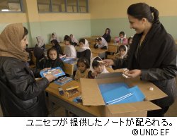 ユニセフ(国連児童基金)の緊急援助は、安全を求めてパキスタンなどの隣国に逃れた難民や、一時100万人以上に達した国内避難民、冬の厳しい寒さや大規模な干ばつなど自然災害の影響を受けた住民80万人が対象となりました。2002年末までに日本ユニセフ協会を通じて現地に送られた日本からの募金は総額1273万4951ドルに達し、難民や国内避難民に対する栄養補助食、医薬品、毛布等の救援物資の提供、子どもの小学校への復帰を促す「バック・トゥ・スクール・キャンペーン」の実施、保健衛生や紛争により心に傷を受けた子どもの心のケアなどの支援事業に使用しました。