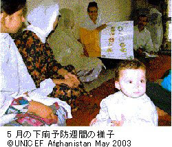 女性と新生児の破傷風感染予防を目的として、ユニセフは2003年に破傷風トキソイド(TT)キャンペーンを開始しました。国内全土での実施を予定している3年間のTTキャンペーンは、第一弾が2月にカブール、マザール、カンダハール、ヤラバードで実施され、出産適齢期の女性の80%に相当する59万人がその恩恵を受ました。3月の第二弾では、女性の83%に対し破傷風トキソイドが施され、第三弾は9月に実施されました。地域レベルのTTキャンペーンも5月と6月にカブール8地区行われ、出産適齢期女性の88%が恩恵をうけました。