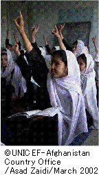 image3  2002年の成功に続き、2003年にもアフガニスタン全土の380万人以上の子どもが学校に復学し、7歳から13歳までの女の子も就学率も30%(2002年)から37%(2003年)に上昇しました。ユニセフはアフガニスタンの女の子の教育状況をさらに改善させるための2年間の包括プログラムを開始しましたが、この活動への資金を早急に必要としています。この包括プログラムでは、学校に通えない女の子を支援し、さらに50万人が新たに学校に通えることが目指されています。またこれまで400万の学齢期の子どもに、2003年の学習に必要な990万冊の教科書と学用品を提供しました。