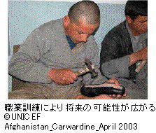image4  ユニセフは子どもの兵士の実態調査を終え、アフガニスタンのパートナーのプロジェクトと共に、子ども武装解除・社会復帰支援プロジェクトを進めています。ユニセフは、地雷注意喚起教育をコミュニティーが自立して行えるようアフガニスタン子ども基金(CFA)を支援し、タハール、バダフシャーン、クンドゥズの地域で活動しています。 アフガニスタン子ども基金の活動により、90のコミュニティーで学校に通うことのできない2,500人の子どもはコミュニティーセンターで教育を、3000人の青少年が職業訓練を受けることができました。しかし、ユニセフは2003年、2004年の活動資金、250万ドルの不足に直面しており、最も重要な活動の継続が懸念されています。