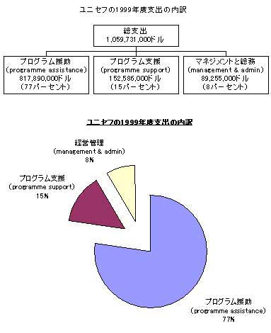 例えば1999年、ユニセフの支出総額は世界全体で1,059,731,000ドル(10億5973万1千ドル)でしたが、そのうち経営管理(management