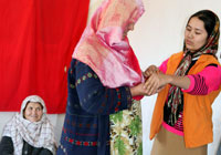 | 大人の生徒に数の数え方を教えるボランティア講師のマリアムさん(14歳)の様子を見守るファリダ・ダステジアさん(65歳)。アフガニスタン北部の識字センターにて。 |