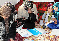 | アフガニスタン北部のユニセフが支援する学校外の識字センターで学習する女性と子どもたち |