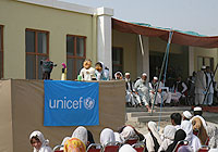 ユニセフは、日本政府の支援を受け、2007年、スルクロード地区で初めてコミュニティが管理・運営するナダク・ビラク学校を開校しました。地元当局とユニセフ・アフガニスタン事務所のピーター・クローリー代表が、開校式典で祝辞を述べました。この学校が建てられる前、村の子どもたちは、屋外で勉強していました。