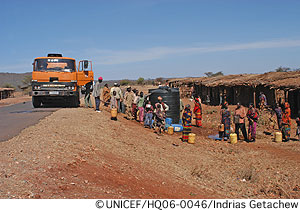 オロミヤ地方からソマリ地方一帯にわたる支援のために、ユニセフ・エチオピア事務所では現在、800万ドルを超える資金を必要としています。この資金は緊急用の給水車の調達や壊れたポンプの修復、新しい井戸の設置や150万人の子どもたちに対するはしかの予防接種のために使われます。2000年に同地域で大規模な干ばつが発生したとき、子どもの死因の20%以上がはしかに関連したものだったからです。
