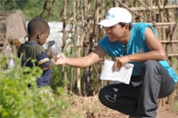 | モザンビークの大洪水被害のため緊急支援チームとして派遣された根本さん。子どもとの触れ合いに笑顔がこぼれます。 |