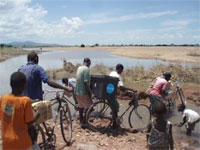 | ときには、支援物資を自転車に積んで運ぶこともあります。道は洪水に流されてしまいました。 |
