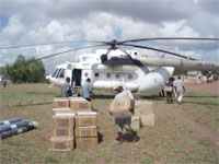 | ユニセフの緊急支援物資は、ヘリコプターで被災地に届けられています。 |