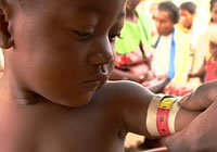 | マダガスカル南部の保健センターで。腕の太さを測られ、栄養不良の状態を調べられている子ども。 |