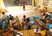 子どもたちを学校に戻すために、ユニセフは50万組のスクール・キット(文具・教材キット)や教育キットを配布し始めました。「多くの子どもたちは一時期避難を余儀なくされました。そして、自宅に戻ってきても、自宅が荒らされて何も残っていない状態だと言います」と語るのは、ユニセフ・コートジボワール事務所のジルベルト・イェブレ・アマリ教育担当官です。「こういうときに役立つのがこうしたキットで、自信を取り戻し、学期末までに元の生活に戻ってもらえれば、と思います」 ユニセフの目的は、100万人近い子どもたちを、なるべく早く学校に戻すことにあります。西部では、今回の混乱に村々が大きな影響を受け、学校の80%が被害を受けています。多くは略奪に遭い、ほとんどの学校では、机と椅子が暴徒化した人々によって燃やされ、なくなってしまいました。授業が再開されたところは、教室が子どもたちで溢れかえっています。 子どもたちが戻った学校でも、教師が不足しています。ミシェル・テヘ・セルーさんは、コートジボワール西部にあるブルル村の学校の校長兼教師です。ここ1ヵ月、ひとりで200人の生徒を教えています。「一番大変なのは、授業の始まりのときです。全員を座らせて、静かにさせるだけで苦労します。6クラス受け持っていますからとても疲れます。でも、子どもたちも協力してくれるし、学校に来られるだけで嬉しいようです。私自身もそうですしね。でも、できれば、ほかの教師たちにも早く戻ってきて欲しいです」学校には、まだ教師の3分の1しか返っていないと言います。 コートジボワール国内で、ユニセフは教師の研修と採用を行い、コミュニティには、子どもと教師たちを早く学校に戻すよう説得しています。 |