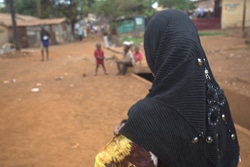 私たちは、エボラから回復した女性と話をすることができました。カディアトゥさんはギニアでエボラの感染が確認された初期の患者です。コナクリの大通りで彼女と待ち合わせて、子どもたちがサッカーをして遊ぶぬかるんだ道を通って、彼女の家を訪れました。カディアトゥさんの母親が洗濯物を乾かしている隣で、私たちはプラスチックの椅子に座り、向かい合って話をしました。