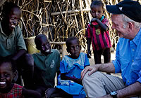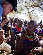 | ケニアのリフトバレー州トゥルカナ地域、カプア村の子どもたちと話すユニセフのアンソニー・レーク事務局長。 |