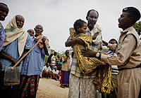 | モガディシュにある検問所で検査を受ける病気の娘を抱えた父親。多くの両親が食糧を求めてやってきている。 |