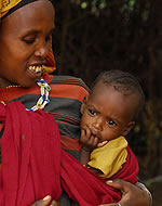 | ザラ・アーメドと生後10ヶ月の彼女の娘ナイレ・ケリファ。エチオピアのフェディスにあるベリーナ・アルバ保健所での毎週の外来栄養治療プログラムにて。 |