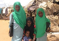 | ファティマ・スシィさんと制服を着た子どもたち(左からナスリちゃん(10歳)、ハミドちゃん(4歳)、スシィさん、ビスハラちゃん(6歳)。ケニア・ダダーブ近くのラビシガレ村にあるマンヤッタ(小屋)の前で。 |