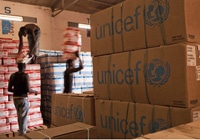 | ユニセフの倉庫で、調理せずに食べられる子ども向けの栄養補助食品の発送を準備するスタッフ (チャドのンジャメナ市内で) |