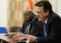 | ユニセフ/世界食糧計画(WFP)の合同記者会見で、質問に答える西部・中部アフリカ地域事務所・デヴィッド・グレスリー部長(右) |