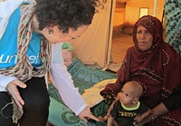| ムベラ避難キャンプで、3歳のハビビくんと祖母・ファギさんに挨拶するユニセフ・モーリタニア事務所のルシア・エルミ所長 (モーリタニア) |