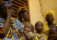 | 栄養不良の子どもの治療を受けられるマリのコニオ診療所で、栄養不良の子どもを診てもらうために順番を待つ親子。 |