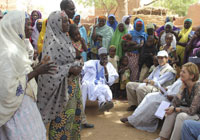 | ユニセフのヨカ・ブラント事務局次長に成功事例を話すニジェール・コルイア村の女性たち。完全母乳育児や改善された衛生設備(トイレ)といった慣習を通して栄養不良から子どもたちを守った。 |