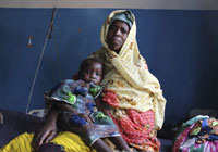 | 重度の急性栄養不良や合併症に苦シム5歳未満児の治療を行っている二ジェールのマラディ地域病院で娘のザヒラちゃんを抱いて座るハリマさん。ザヒラちゃんは治療を受け、回復に向かっている。 |