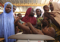 | ユニセフが支援しているニジェールにある治療用の給食センターで、定期健診を受け、体重を量られている子ども。 |