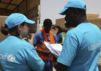 | モーニタニアのヌアクショットで貨物機から支援物資を降ろすユニセフのスタッフ。 |
