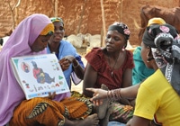 | ニジェールのガリン・ゴウルビ村で、母親たちに適切な栄養を摂取することの重要性について説明するゾウヘイラ・イッサさん(左)。 |